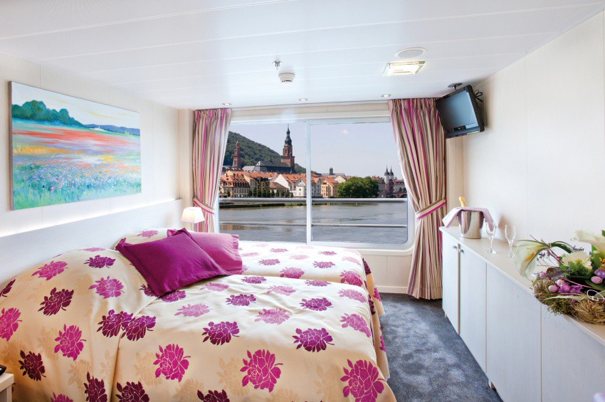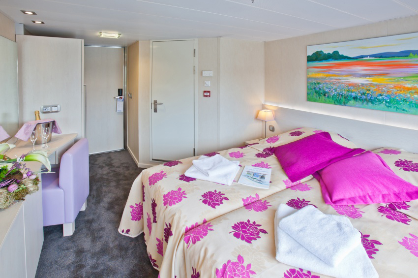 Spacious and comfortable cabin adapted for passengers with reduced mobility and equipped with two beds, private bathroom with shower and bath products, satellite TV, safe, hairdryer and radio. Located on the middle deck with picture window with sliding top section, it offers a great view of the landscapes.