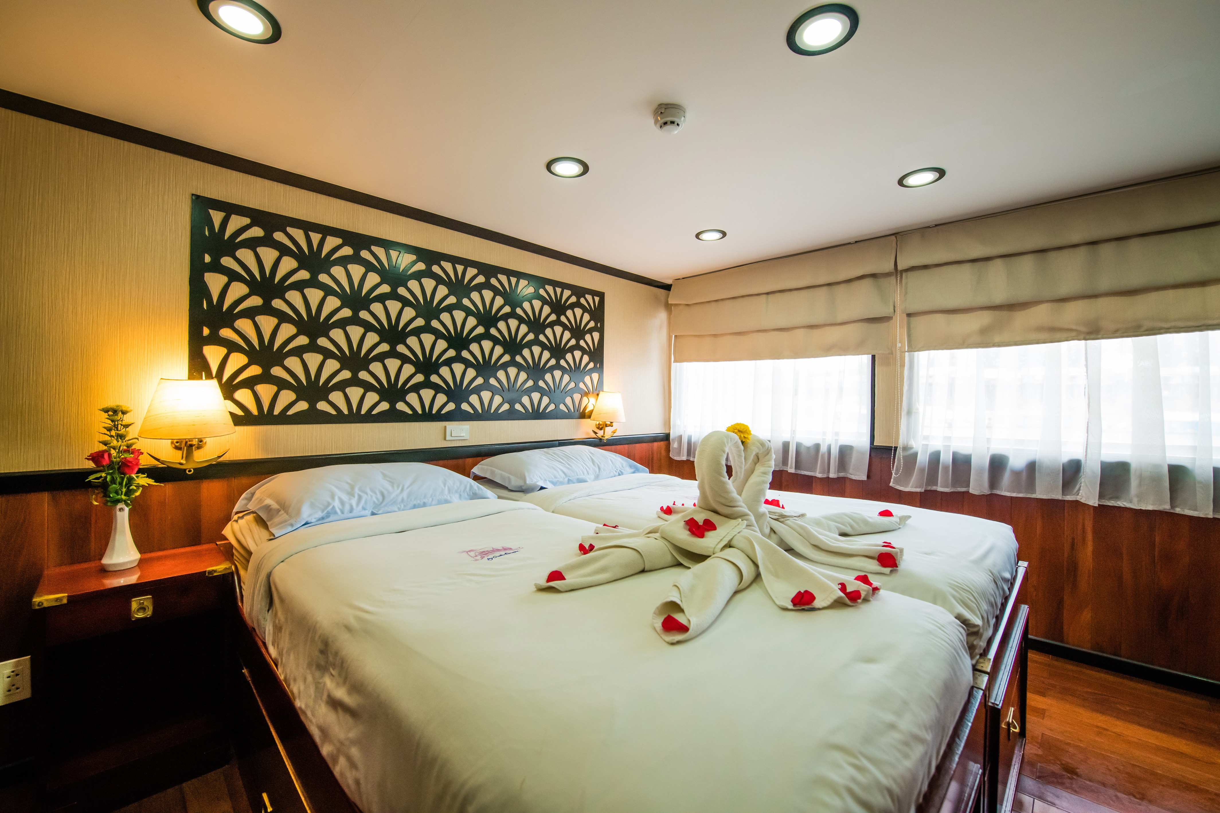Spacious and comfortable cabin equipped with two beds (with optional twin-bed configuration), private bathroom with shower and bath products, telephone, satellite TV, safe, hairdryer, air-conditioning, radio and wardrobe with hangers. Located at the main deck with window overlooking the exterior passageway, it offers a panoramic view.AmenitiesCabins are spacious and comfortable, with plenty of lightConveniences: All cabins are exterior-facing and equipped with two low beds that can be joined together, large storage space, private bathroom with shower, air-conditioning, safe, hairdryer, dresser. Toiletries are available for your use. Onboard Wi-Fi.Facilities / Services on board:Onboard shopLecturesLibrary with classic literatureWi-FiLaundry service (In Phnom Penh)